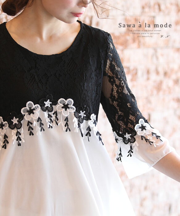 お花の刺繍とレースが可愛い大人ブラウス レディース ファッション トップス ブラウス シャツ 刺繍 レース黒 白 7分袖 大人可愛い 40代 レディースファッション 50代女性 ファッション 60代 ミセスファッション サワアラモード sawa a la mode otona