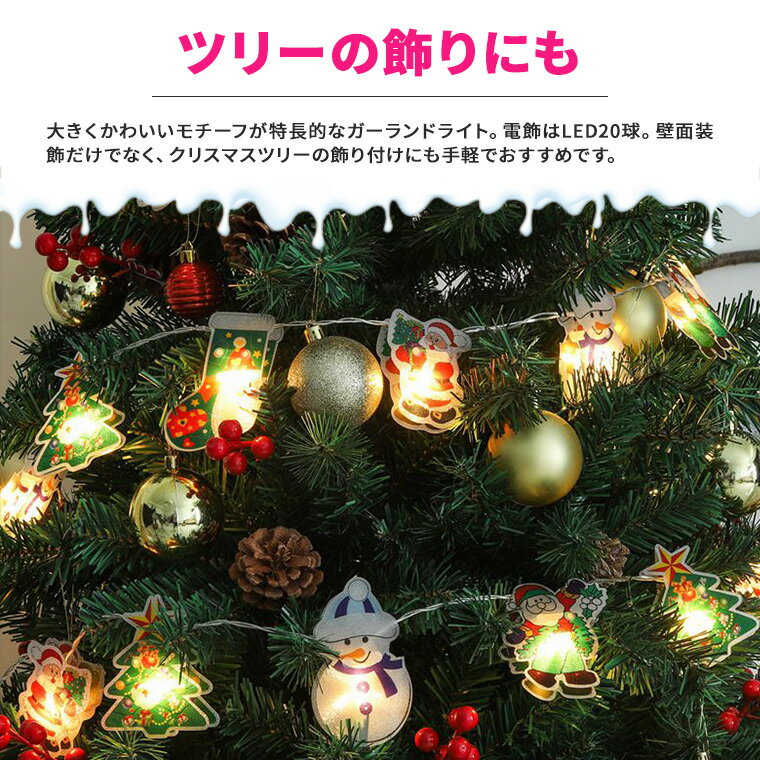 ガーランド ライト 室内用 イルミネーション クリスマス モチーフ W 2.5m 20球 電池式 リモコン付属 かわいい サンタ ツリー 雪だるま オーナメント ストレート ストリング 電飾 パーティー 装飾 飾り付け おしゃれ
