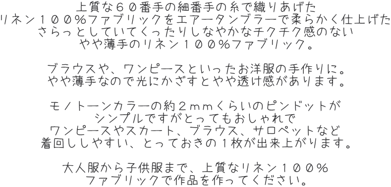 『クラシックピンドットリネン』60番手リネン100%プリント(やや薄手)生地幅:約102cmモノトーン/子供服/女の子/キッズ/大人服/麻/ウェアー/小物/インテリア/ハンドメイド/手づくり/