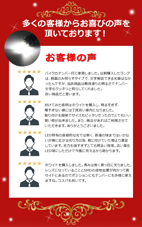 ・正面にLEDが付いているタイプなのでナンバー灯やポジション球  に装着するとより見栄えが良くなります。