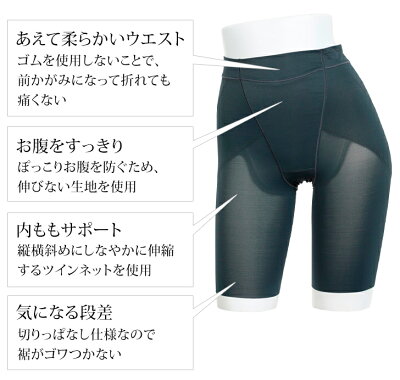 お腹部分: 前身頃中心は、伸縮性のない薄いマーキゼットを内蔵した三重構造で、ぽっこりお腹を押さえます。
