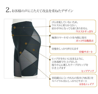 臀溝ラインをしっかりと裏当布パワーネットで押さえてヒップアップさせ、骨盤をしっかり押さえ、前中心へ引っ張り上げるよう設計しているため、足が上がりやすく歩きやすくしてあります。