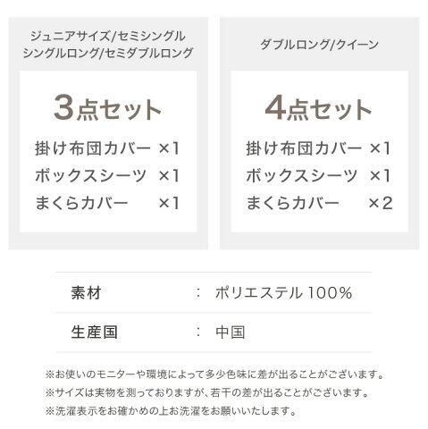 ●敷布団用3点セット【材質】ポリエステル100%【サイズ 規格:シングルロング】掛布団カバー:150×210cm/敷布団カバー:105×210cm枕カバー:43×63cm【生産国】中国●ベッド用3点セット【材質】ポリエステル100%【サイズ 規格:シングルロング】掛布団カバー:150×210cm/ボックスシーツ:100×200×25cm枕カバー:43×63cm【生産国】中国※洗濯表示をご参考の上お洗濯をお願いいたします【商品の注意点】こちらの商品はサイズ規格がシングルロングとなっております。