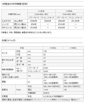 仕様(スペック) 形名 C14DBL C18DBL のこ刃 外径 mm 125 穴径 mm 20 最大切込み深さ 90°時 mm 47 45°時 mm 30 逆15°時 mm 20 無負荷回転数 min -1 (回/分) パワーモード 5,000 サイレントモード 3,000 機体寸法 (全長×全幅×全高) mm 257×168×237 (BSL1450装着時 277×168×237 (BSL1850装着時) 質量 kg 2.4 (BSL1450装着時) 2.5 (BSL1850装着時) 蓄電池 5.0Ah 形名 BSL1450(冷却対応) BSL1850(冷却対応) 電圧 14.4V 18V 充電時間 約35分 充電器 形名 UC18YSL2(冷却機能付) 標準付属品:チップソー