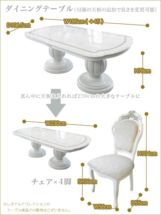 テーブルサイズ:W185 (+45) ×D106.5×H78cm チェアサイズ:W56×D55×H107×SH50cm チェア張り地:ファブリック 材質:MDF 生産国:Italy ※商品のお届けは玄関渡しとなります。