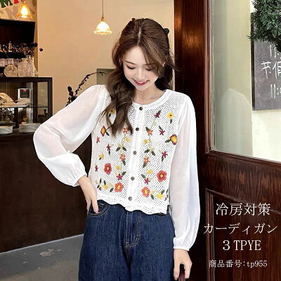 カーディガン レディース 春 春夏 ニット 長袖 ショート丈 トップス コーデ コーディガン 刺繍 シースルー 前開き ボタン留め エアコン対策 冷房対策 カジュアル