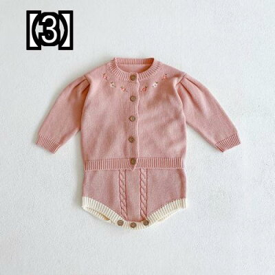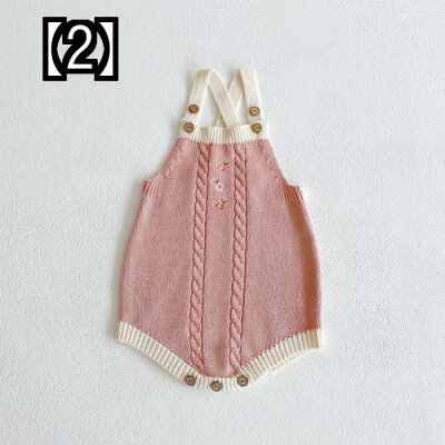 べビー サロペット ニット コットン 春秋 ロンパース 女の子 花 刺繍 調節可能 股下 ボタン カーディガン リブ 暖かい 韓国 かわいい ピンク