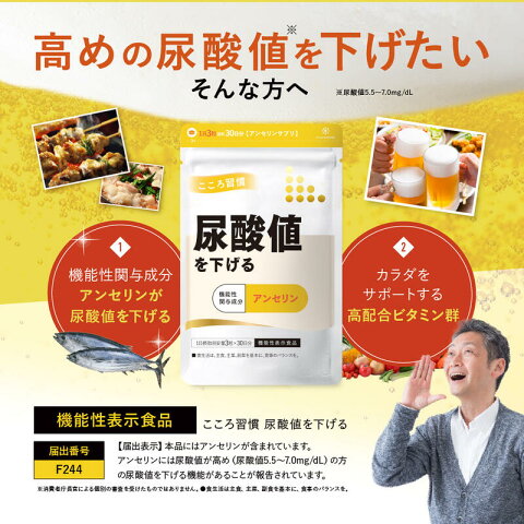 【Wでアンセリンが働きかける】 尿酸のもとであるプリン体の生成抑制、排出の促進に Wで働きかけることによって尿酸値を下げます! 【普段の食事で不足しがちなビタミンも配合!】 ビタミンB1、ビタミンB2、ビタミンB6を独自配合。