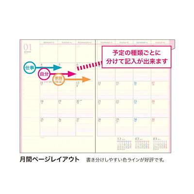 特徴●時間管理が気軽にできる手帳です●編集タイプ「B-1」●B6サイズ/176ページ●月曜始まり1日ごとに、「スケジュール記入欄」「チェックリスト」「フリーメモ」がコンパクトにまとまった週間スケジュールページが特徴の手帳です。