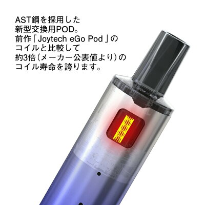 コスパに優れた人気機種「 Joytech eGo Pod ( ジョイテック イージーオー ポッド )」がアップデート! AST鋼によりPODの長寿命化と濃厚で安定したフレーバーを実現した後継機が登場! (1)前作からPOD寿命が大きくアップデート AST鋼を採用した新型交換用PODにより、長寿命かつ豊かなフレーバーを実現。