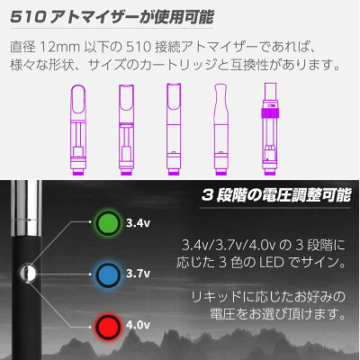 〇 3段階の電圧調節機能搭載 お好みの電圧調節(緑:3.4V 青:3.7V 赤:4.2V)でお楽しみ頂けます。